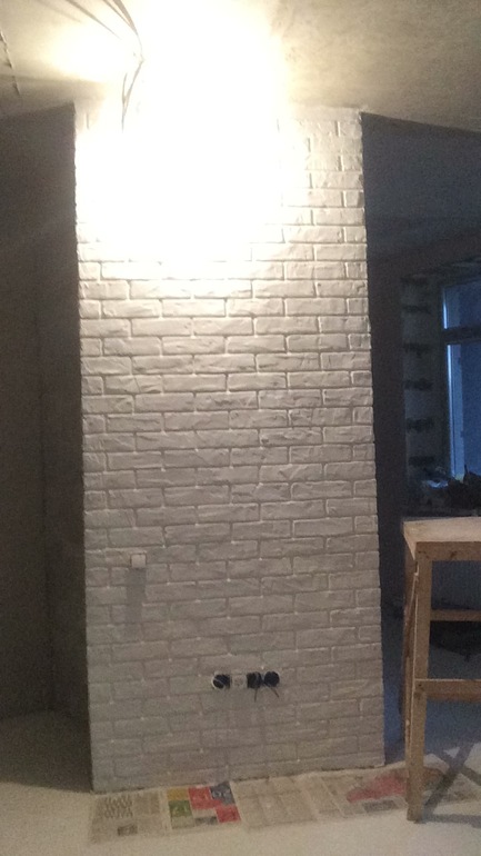 Муж брал гибсовую штукатурку Ротбанд, слой старался делать тоньше, но как по мне лучше чуть толще, более естественно смотрится если хочется под состаренный кирпич. И швы можно было б тоньше, но нам и так нравится.Вот что получилось