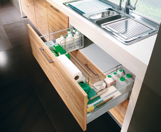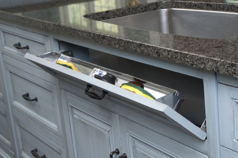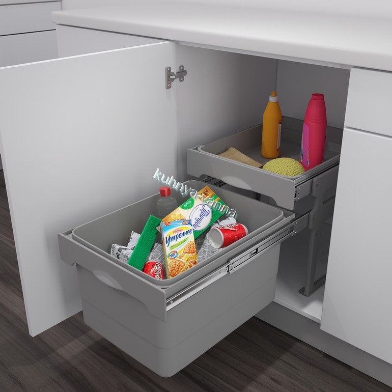 У моих родителей как на первом фото. В верхнем ящике у них чистящие средства, новые губки, тряпки, кухонные полотенца, мусорные мешки. А в нижнем стоят вёдра мусорные. Очень удобно. Но влажные губки туда конечно не кладут.