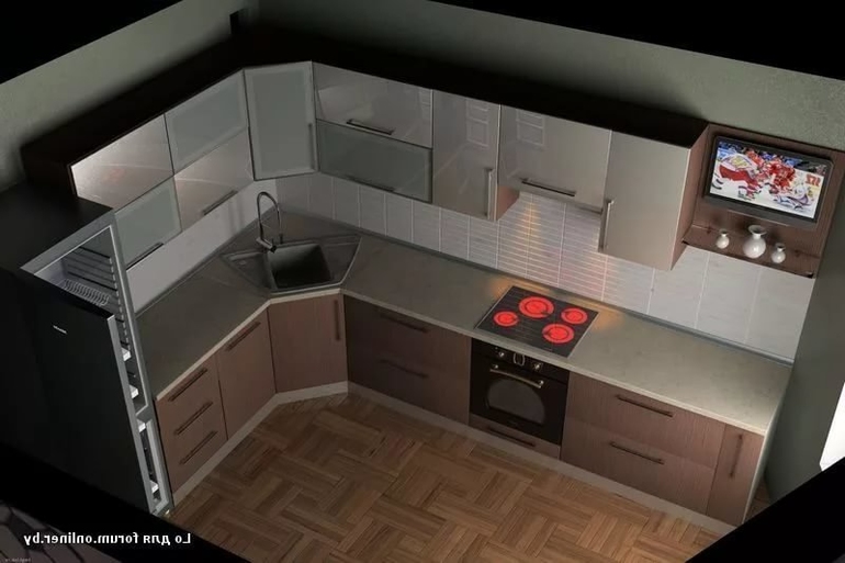 Я когда то пользовалась кухне в которой угол был обыгран интересно. Там было что то типа подиума. Очень удобно. Там и хлебница удачно стояла. И всякие нужности. Типа подставки с ножами. Чайник. Мойка была с краю с лева. А плита с краю с права.