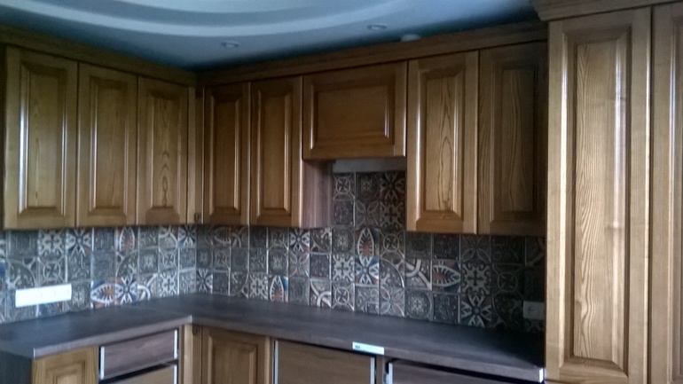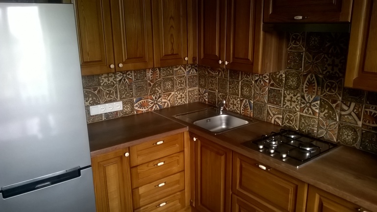 Мало места между мойкой и варочной. Работать между плитой и раковиной лучше, когда места больше. если внизу прямой угол, то и вверху сделайте такой же. Или две трапеции - там и там.
