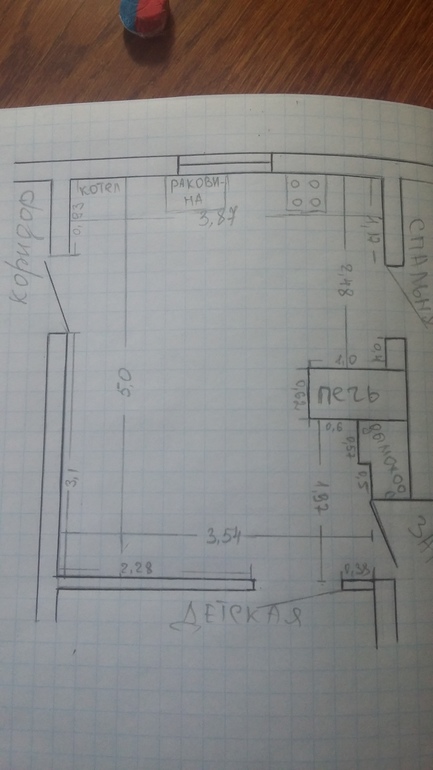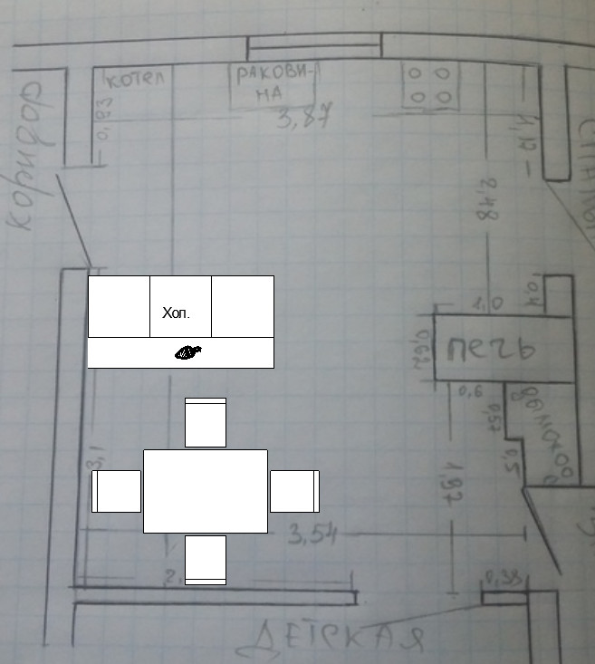 Интерьерное решение кухниДобрый день. Нужна ваша помощь. Я уже голову сломала с дизайном кухни. Кухня большая, но пороходная. У нее 4 двери и есть печка.рабочая зона возле окна. Обеденная в углу со стороны детской. Там я хочу поставить большой стол со стульями и холодильник. А вот как решить проблему с маленьким количеством места для хранения не знаю. Фото чертежа кухни с размерами прилогается.