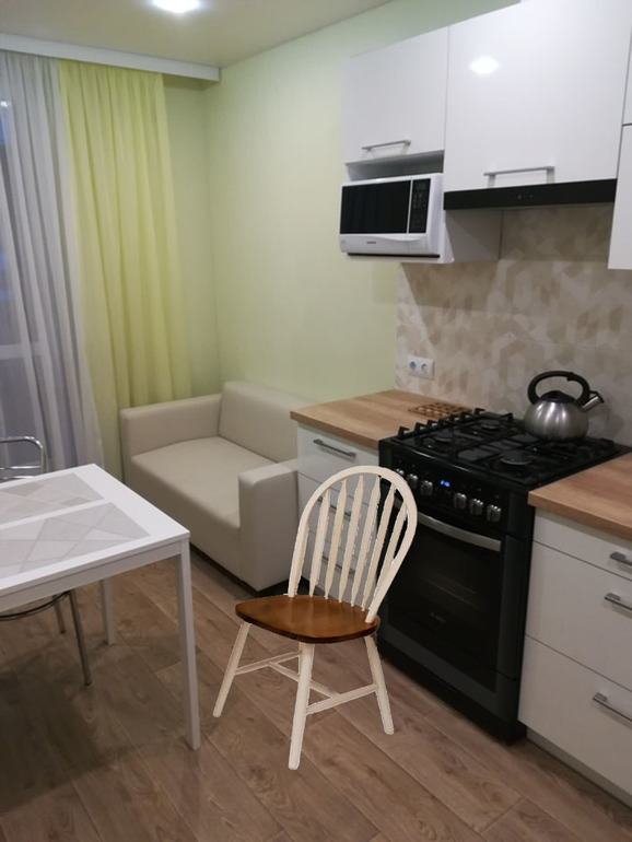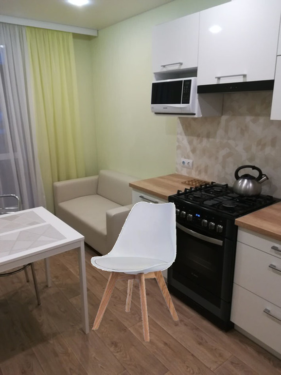 Если брать стул белый, а ножки под столешницу, то они сольются с полом