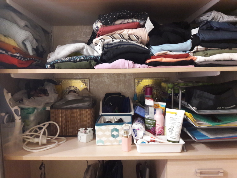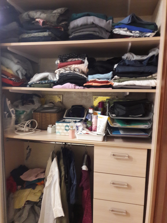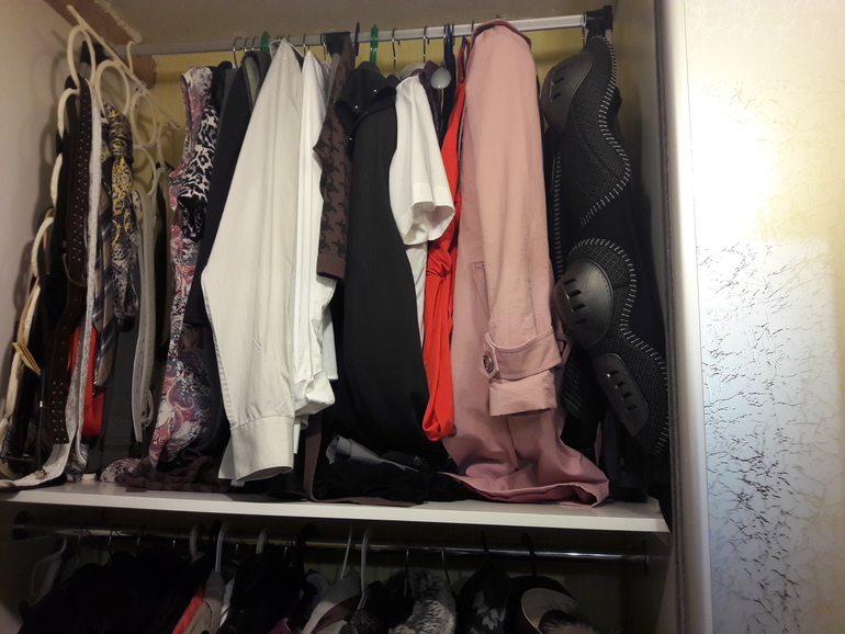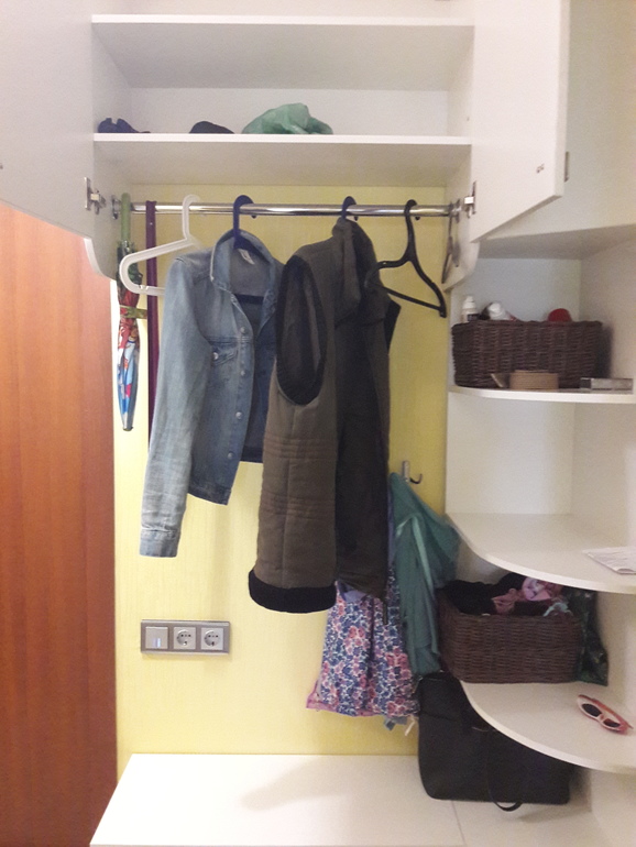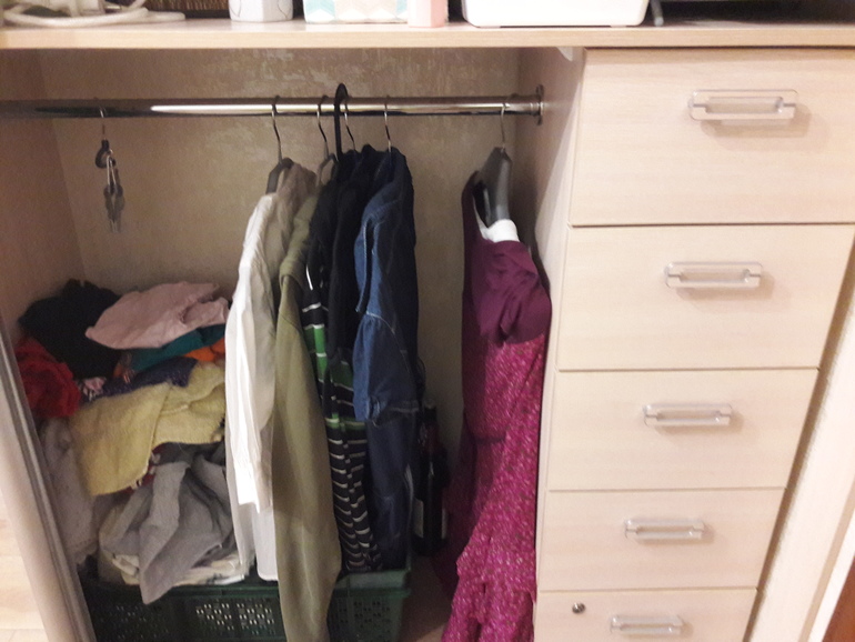 правая сторона моя: мини-комод,одежда, небольшая штанга (внизу ящик с неглаженным бельем. опять надо в икею - купить что-то другое), и полка с моими всякими побрекушками
