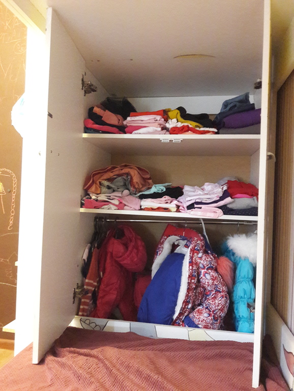 Одежду вешаем на плечики и на штангу и внизу крючок для одежды дочки