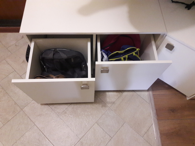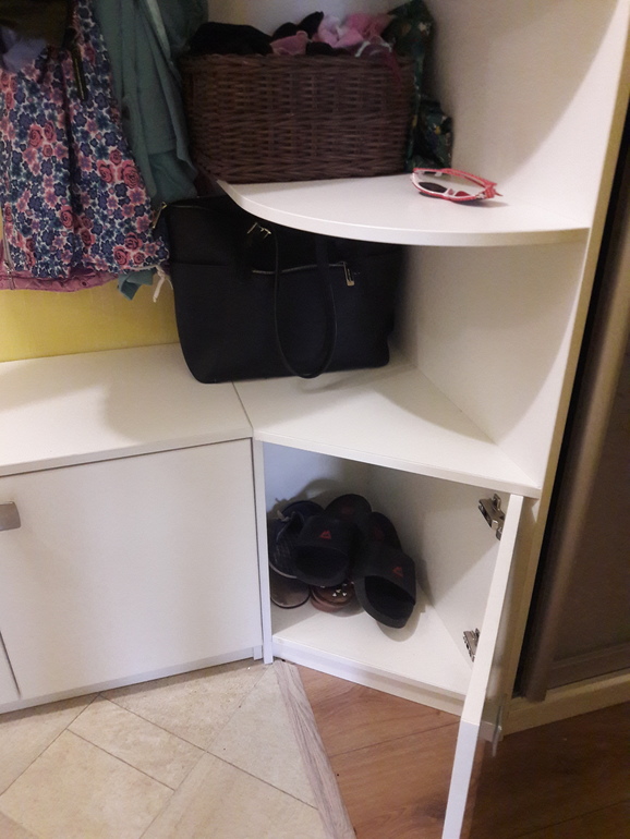 вниз хочу сшить 2 желтые подушечки, чтобы мягче было сидеть обуваться (а может и не хочу)). внизу 2 выдвижных ящика для сумок (хотя я планировала, что левый будет для уличных игрушек дочки, но что-то пошло не так и она тоже туда складирует свои рюкзаки))