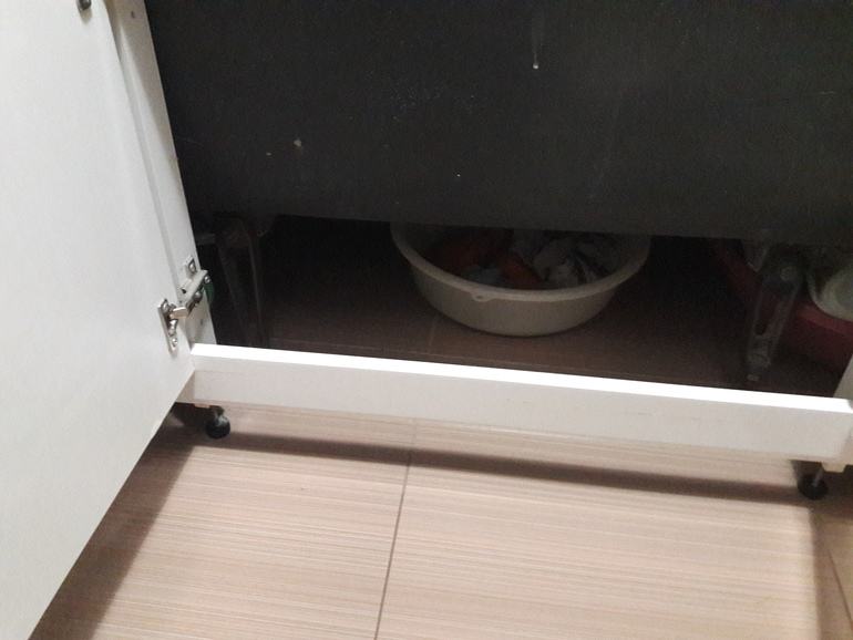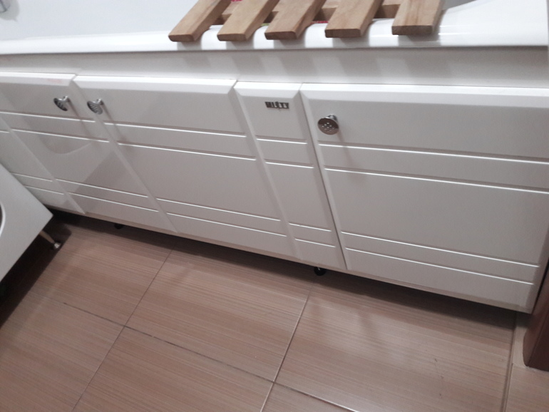 под ванной экран, где хранятся тазики, ведра, веник и т.п. приятные мелочи))