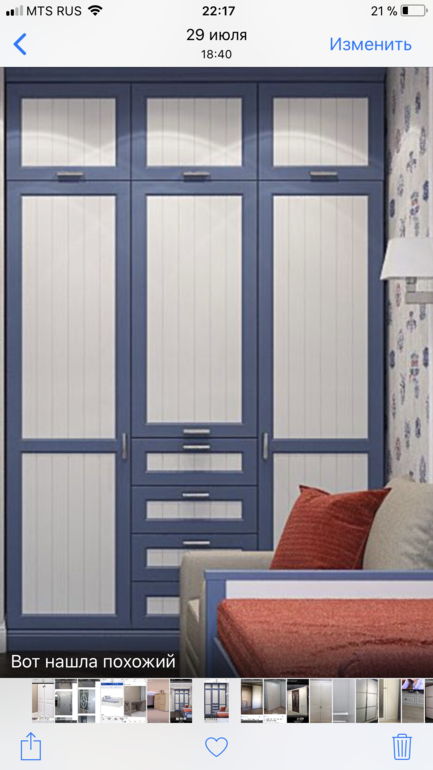Мы будем изготавливать на заказ) А вот с фасадами подзастряли что-то))) Кидаемся из крайности в крайность, то строгие, то полосатые, даже узор из МДФ на стекле хотели🙈 Но визуально нравятся тот, что с рамкой и полосками, и симпотно и под кушетку нашу очень подходят))) и узоры из МДФ на дверях очень нравятся, но тот рисунок, что нравится мне, как-то не очень подходит к нашей Кровати 😏
