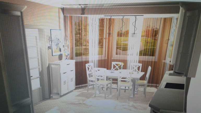 В эркере стол, справа основной гарнитур, слева тумба, на которой планируем поставить чайник, кофемашину.