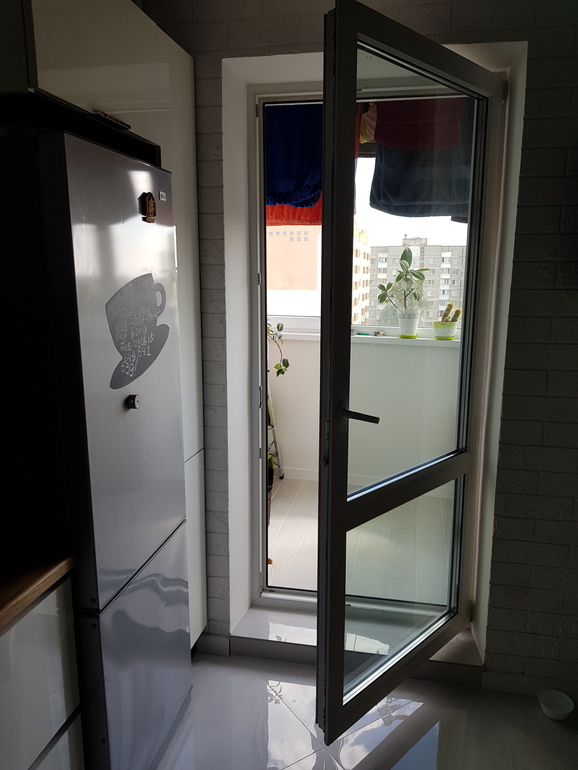 На балконную дверь повесили самую дешевую рулонку из Леруа, она оч красивая-почти белая с легким восточным орнаментом.
