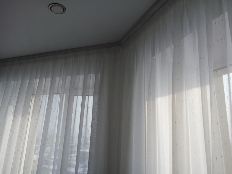 Вот мой карниз. Выглядит как белая жесткая палка, мастер гнет его на месте, специальным аппаратом под ваш угол