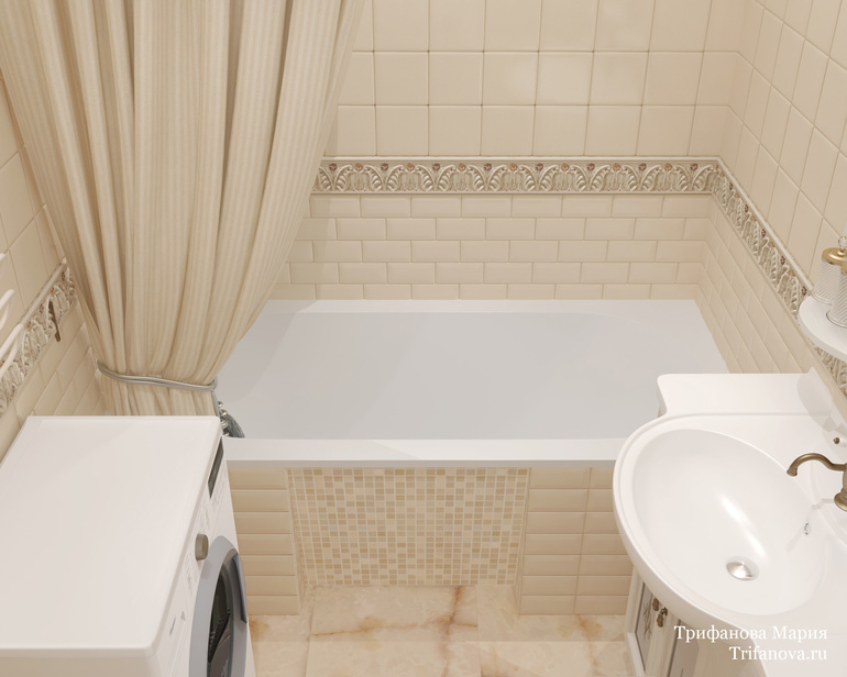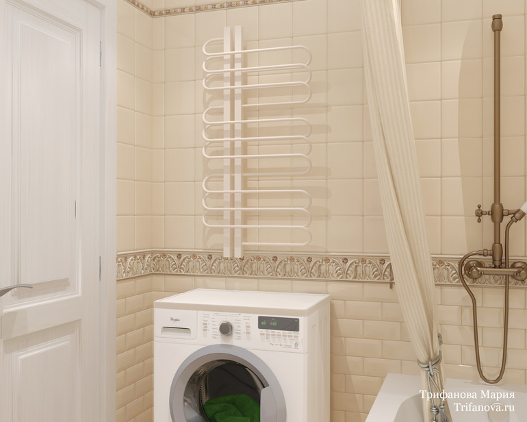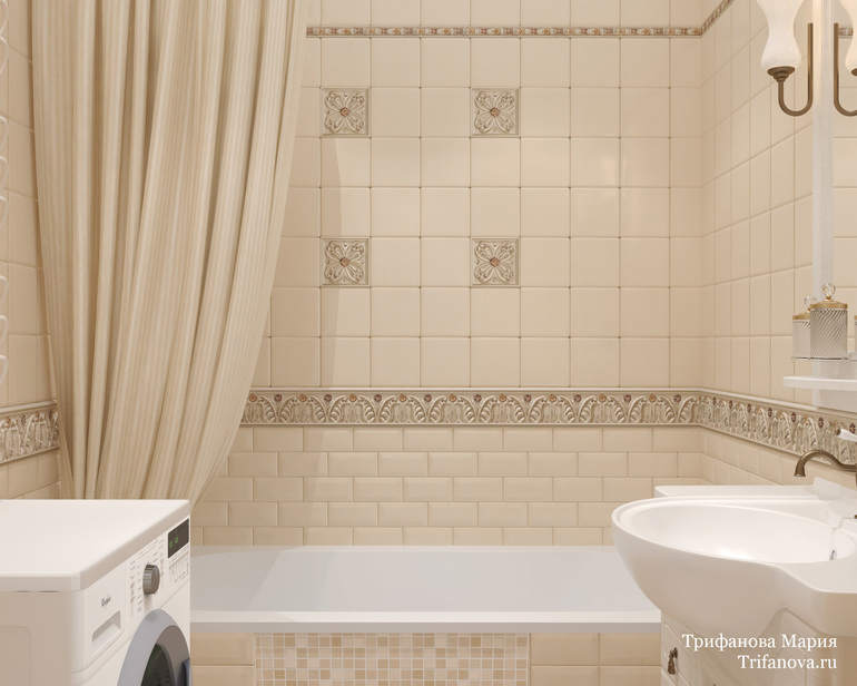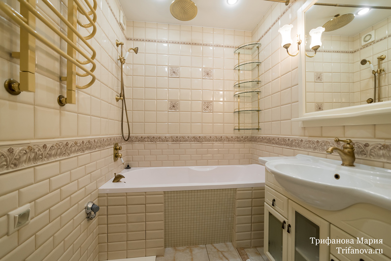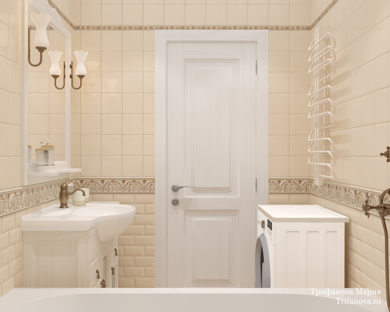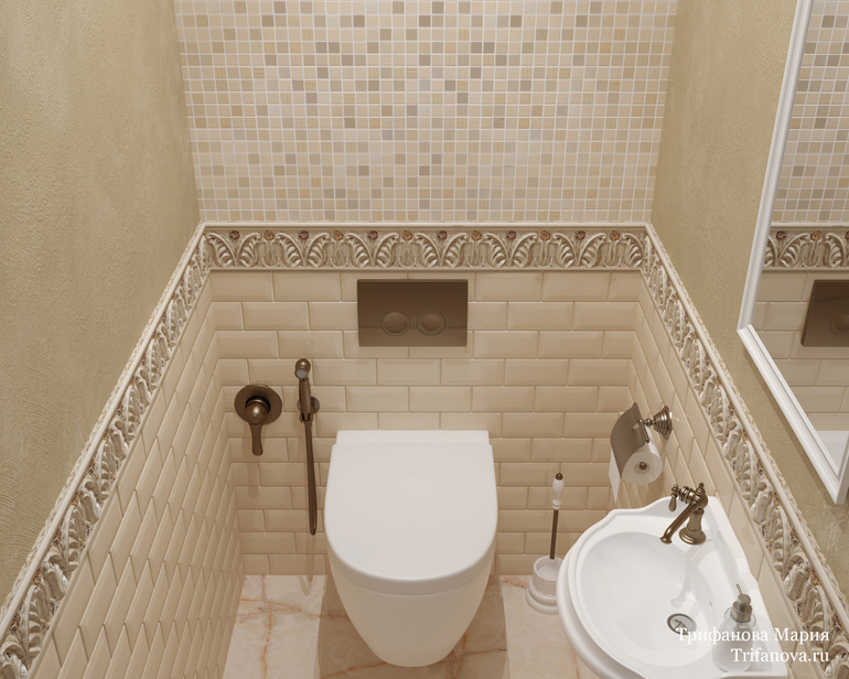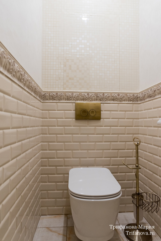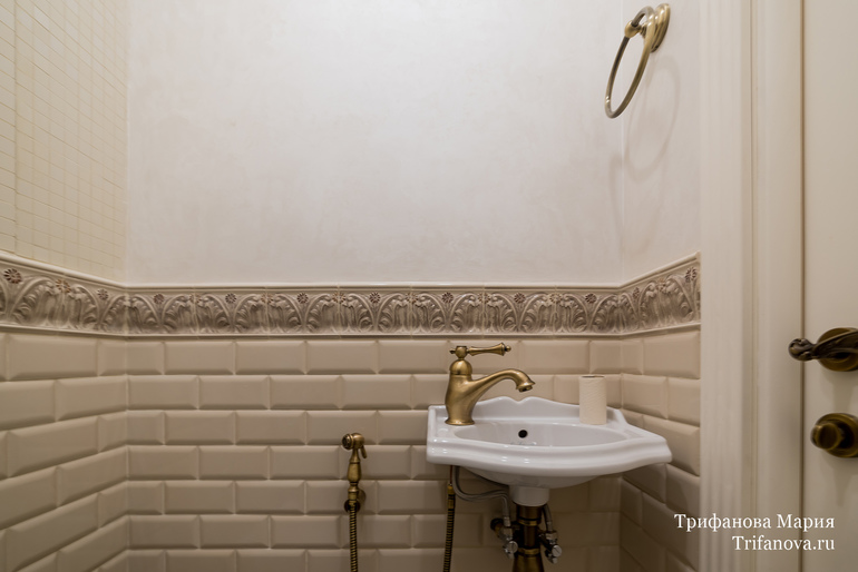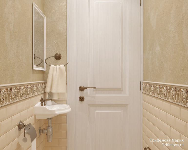 Для санузлов была выбрана коллекция плитки с объемными элементами. Коллекция в сдержанной цветовой гамме в бежевых тонах. В туалете плитка сочетается с декоративной штукатуркой бежевого цвета. За переливающейся мозаикой спрятан ревизионный люк для доступа к коммуникациям.