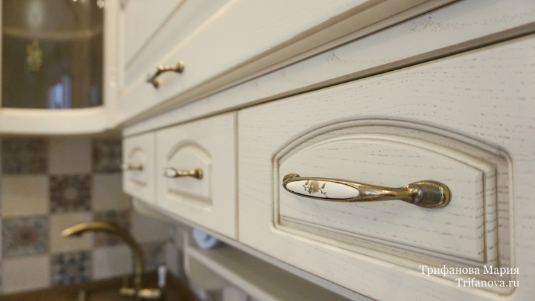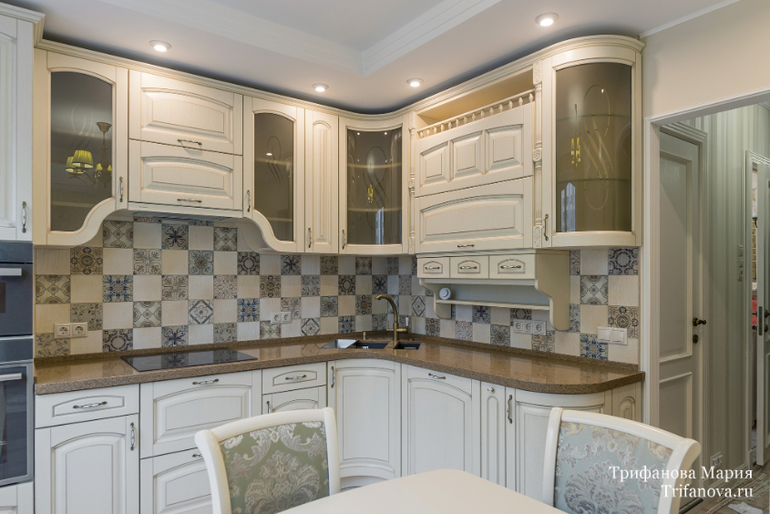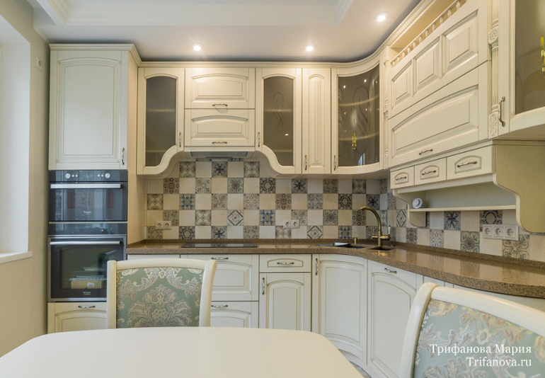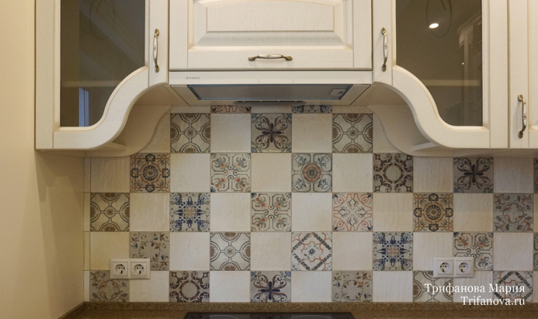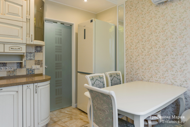Дизайн интерьера кухни разрабатывался в бежевой гамме. На кухне, не смотря на небольшие размеры, удалось разместить все необходимое. Холодильников в квартире 2, второй расположен прямо за раздвижной дверью. Дверь из матового стекла, прячется в специально оставленную под нее нишу. Фартук кухни украшает испанская плитка с орнаментальными узорами. Кухонный гарнитур производства «Зов».