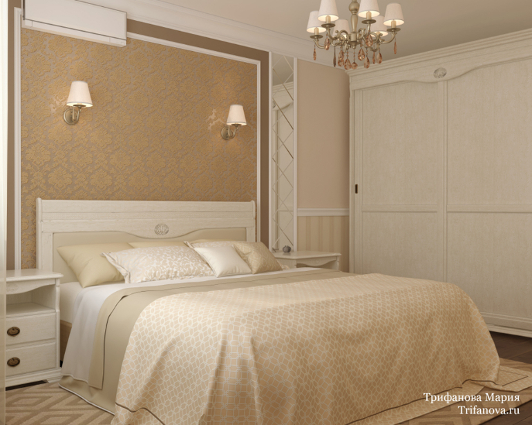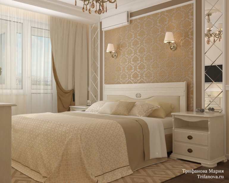 Дизайн интерьера спальни разработан в бежевых тонах. Обои с мягким отблеском придают пространству глубину, а зеркала по бокам от кровати вносят дополнительную изюминку. В углу у окна расположился туалетный столик для заказчицы.