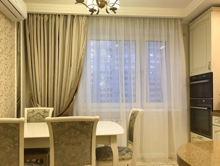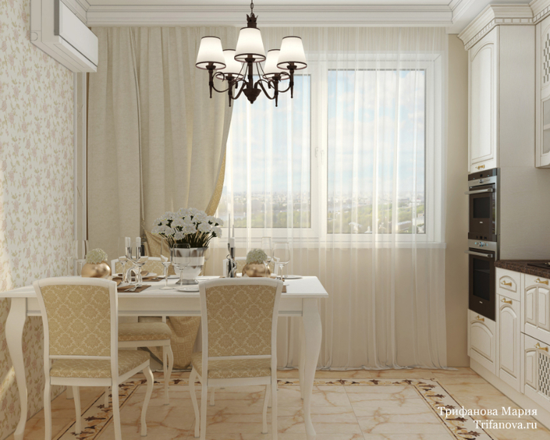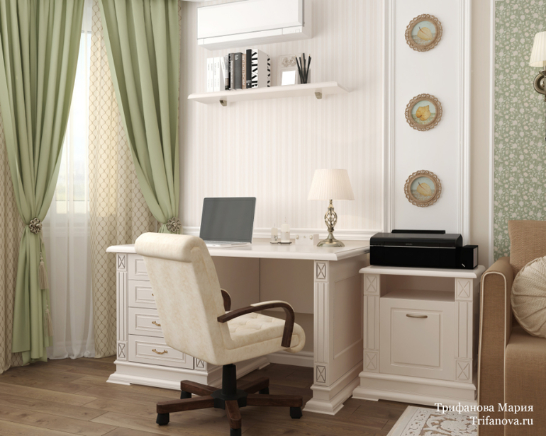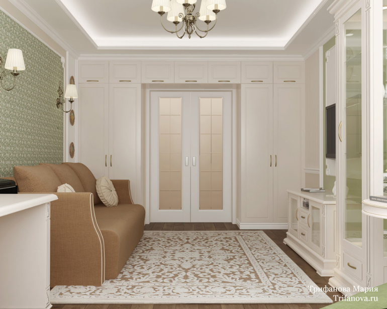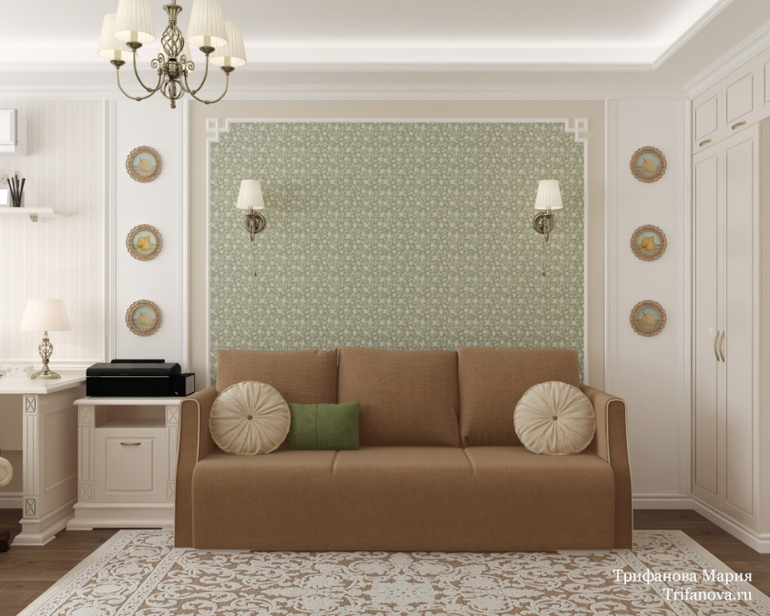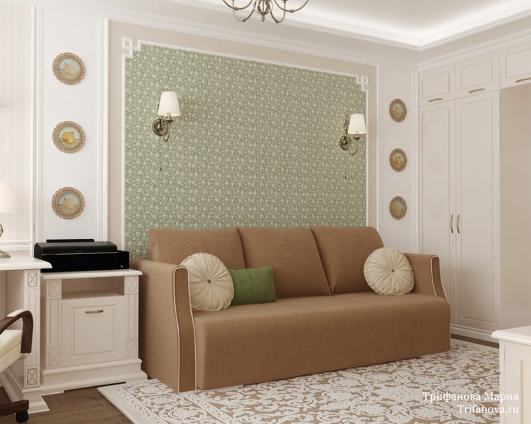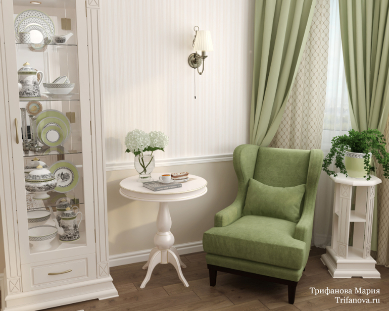Дизайн трехкомнатной квартиры разрабатывался для молодой семейной пары. Квартира в классическом стиле в светлых тонах, которые визуально увеличивают пространство. Дизайн интерьера гостиной выполнен в теплой оливковой гамме. Нежные обои с цветочным принтом удачно вписываются в общую картину. В эркере образовалось уютное место для чтения, с мягким креслом и небольшим кофейным столиком.