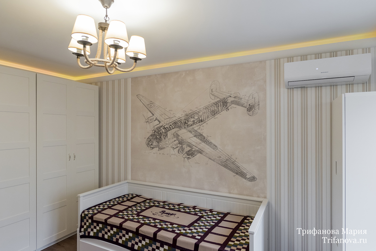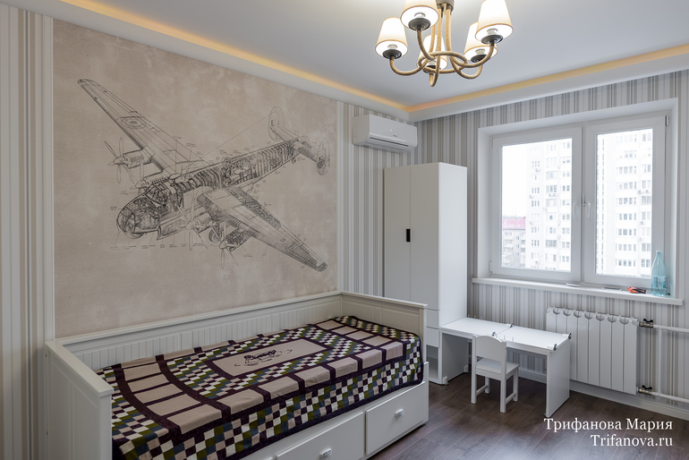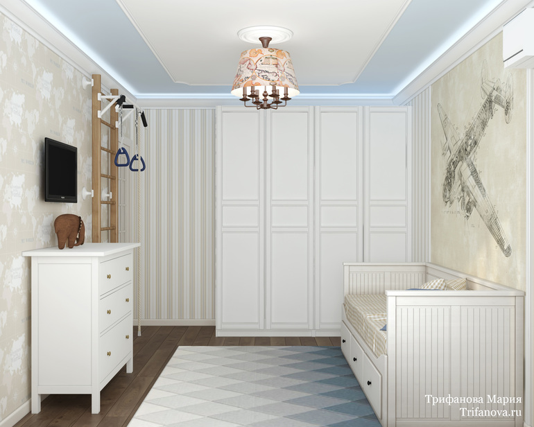 Дизайн детской для мальчика в бежевой гамме с нежными голубыми акцентами. Над кроваткой большая фреска с чертежом самолета. напротив кровати обои с принтом карты, что навевает мысли о путешествиях и исследованиях. Вдоль окна встала икеевская Система Стува - то, что нужно для малыша. В будущем вместо детского столика встанет рабочий стол.