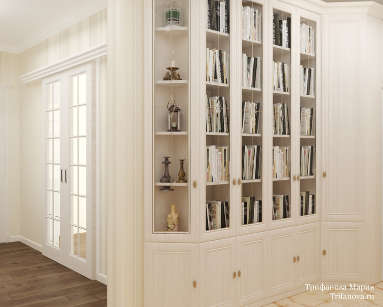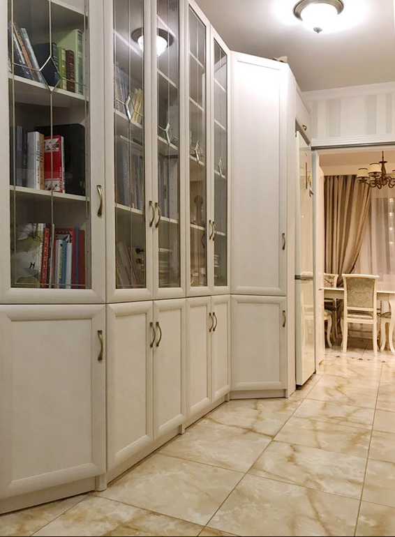 Коридор в нейтральных бежевых тонах. В коридоре находится большой глубокий встроенный шкаф, где отлично уместился пылесос. В узком коридоре по направлению к кухне разместилась библиотека для книг заказчиков. Также в коридоре встал второй холодильник. Около входа находится панель с крючками под одежду и высокая обувница.