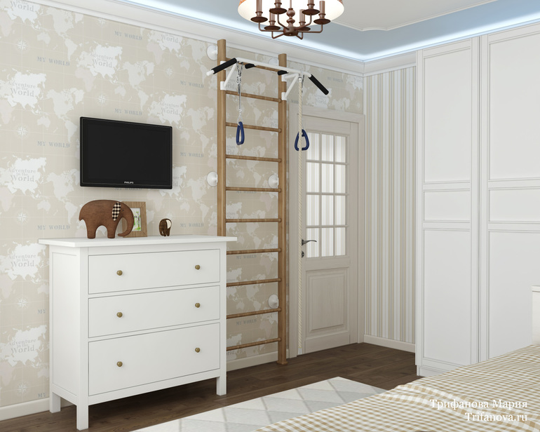 Голубой потолок заказчики делать не стали. Время поджимало, надо было быстрее заканчивать ремонт и потолок решили упростить. На фото еще отсутствует комод и шведская стенка. Система Стува на момент фото была не до конца собрана, один модуль ожидал своей очереди. Как и во всей квартире, штор и ковра на момент фотографирования в детской еще не было.