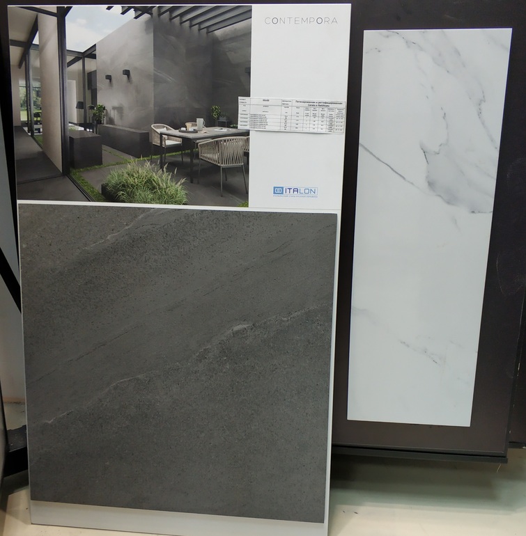 Два месяца путешествий по всем салонам керамической плитки. И вот результат. Пол и одна стена (от пола до потолка), на которой установлена инсталляция, будут почти черные Italon Contempora Carbon. Остальные стены белые под мрамор Alma Ceramica ILANA.