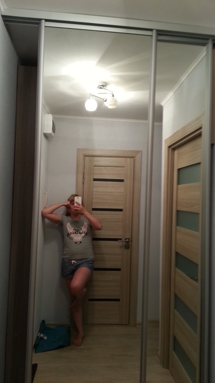 Щас все попадают с моего бардака))) ну как есть! У нас аппендикс в коридоре примерно 1.5 на 2. Есть отсек с вещами мужа и моими, это очень удобно, не перемешиваются))) Плюс куча полок. Вход отгораживает раздвижные двери - зеркало.