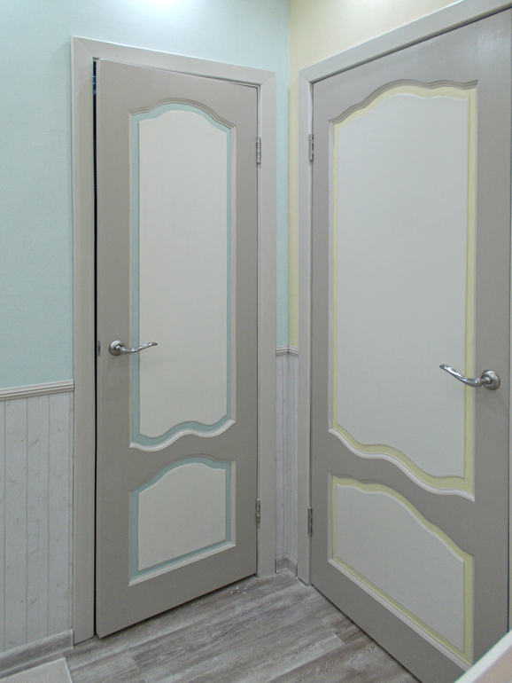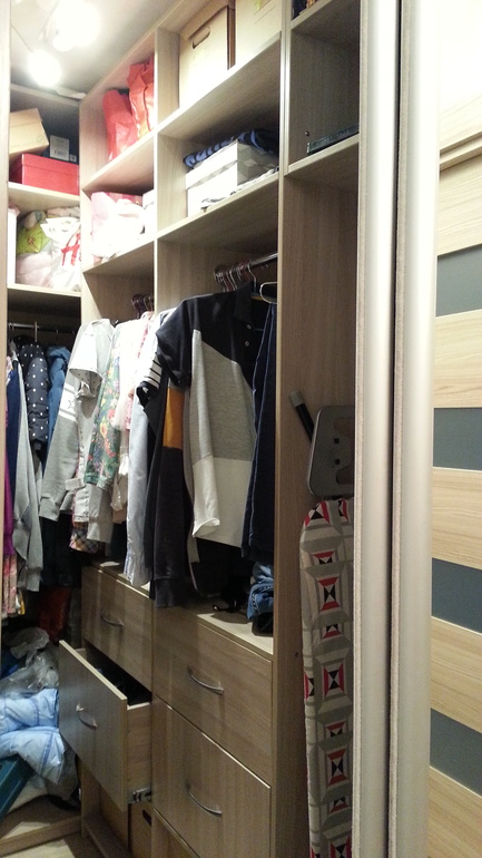 По длинной стене стоят два комода, над ними штанга во всю длину. В торцевой стене полки, внизу детская штанга. В углу за комодами стоит невысокий шкафчик, т.к. над ним висят длинномеры. Ну и карманы-органайзеры, в которые влезает неожиданно много. Еще место для гладилки между комодом и стеной. А вверху полочка для утюга, полотенец и мелочевки. Вверху двойная антресоль по периметру.