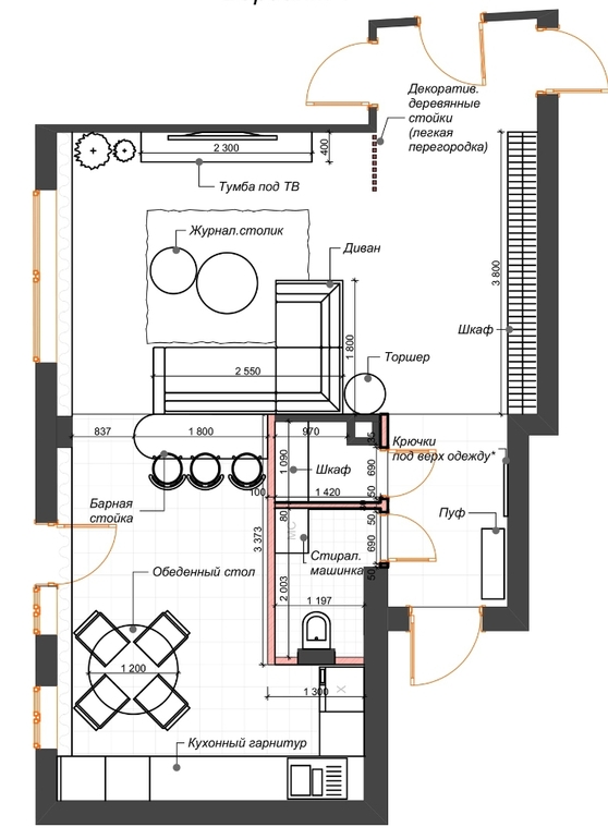Меня смущает расстояние от обеденного стола до кухонных пеналов - если это они. И рабочая поверхность маленькая получается. Я бы попробовала или обеденный стол перенести на стену смежную с с/у и отказаться от барной стойки или попробовать развернуть кухню как раз по той стене. А в нижний прямоугольник столовую зону... Но это в качестве эксперимента, посмотреть, покрутить.