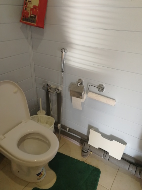 С полотенцами пока экспериментирую на крючках с присосками (7 раз отмерь...), но пока мне удобнее брать с собой. Как-то не могу свыкнуться с висящим на всеобщем обозрении полотенцем для интимных мест, а спрятать его в таком туалете некуда. Плюс оно должно быть как изолировано, чтобы гости руки не вытирали или ребенок не перепутал.