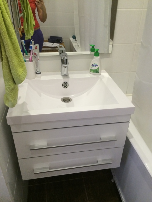 Раковина самая дешевая из икеи, название не скажу-они сложные) что-то до тысячи. А тумбу делал молодой человек, который всю мебель в квартире делал. Тумба вышла 5800. Без ручек