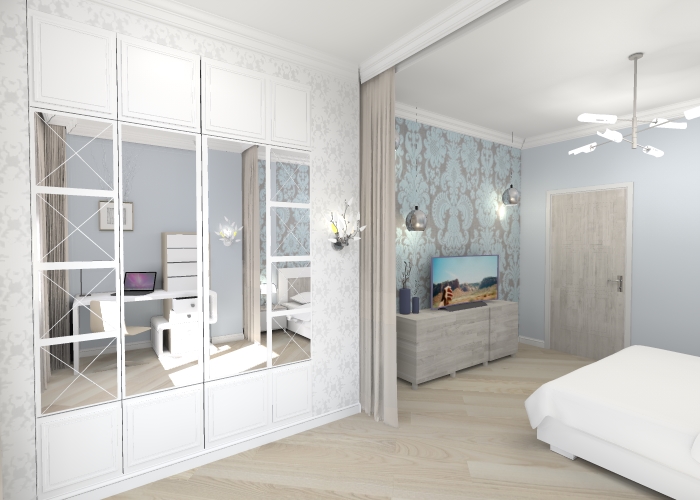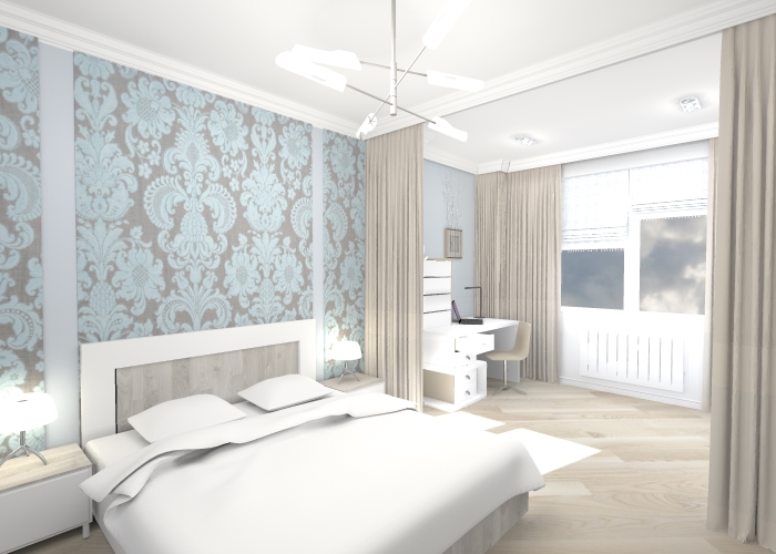 Алёна, зоны я бы точно поменяла бы местами. Да и освещение надо продумать : зачем у тв два светильника? В «рабочей зоне» два точечных. Это мало. Над кроватью люстра , а там нет. Смотрится одиноко, или убрать её, сделав только точки. И модель стола мне кажется неудобной плюс спорит со стилем. Да и часть рабочей поверхности занято ящиками. Зачем? Я бы от телевизора Светильники перенесла к рабочему столу точно.