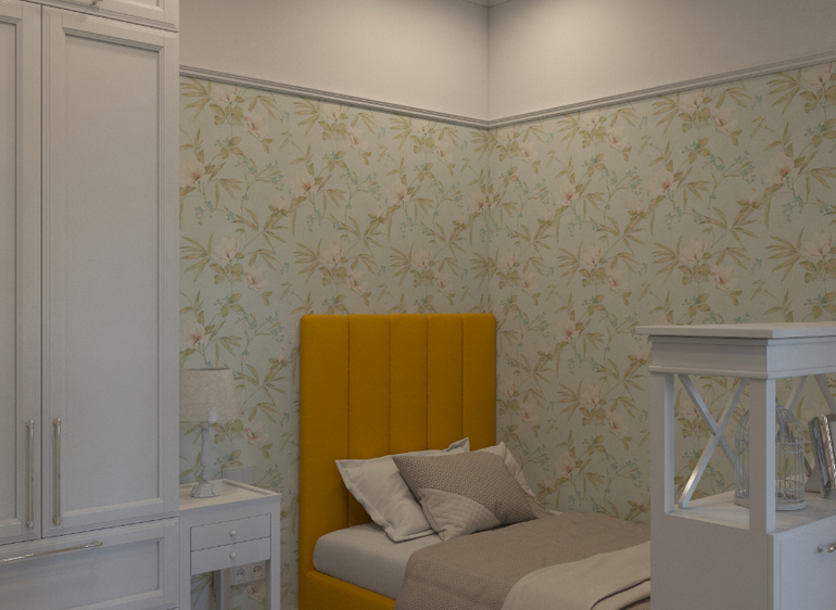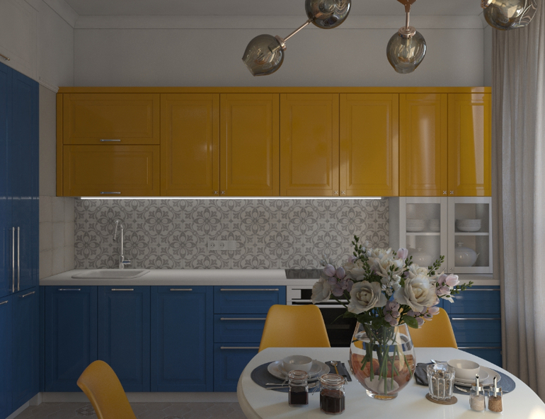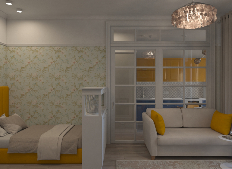 Цветовое решение, пожелание заказчика. Именно с сине-желтого сочетания и началось построение интерьера кухни и потом уже гостиной. За диваном стационарная перегородка, дверь раздвижная и ходит параллельно перегородке. Гардеробный шкаф, кровать и стеллаж будут на заказ.