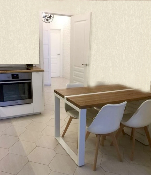 Интерьерное решение кухниДоброго времени суток, ох эта кухня.... предстоит выбрать плитку для фартука. Сделала примерно то что имеем. Потолок белый, обои песочного оттенка, светлые фасады (глянец), столешница (относительно темная, под дерево), светлый пол (плитка). Рассматриваю пока два варианта плитки для фартука: 1.Кабанчик (белый) ; 2. Шестиугольники (светлые,белые)