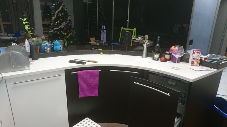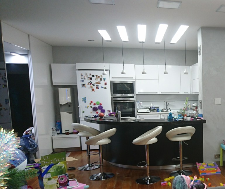 У меня несколько другая история. Кухня вся белая, включая столешницу и чёрно/белый полу-остров с верхней столешницей из чёрого с авантюриновыми вкраплениями кориана. Попробую показать, что имею в виду под серым цветом стен.