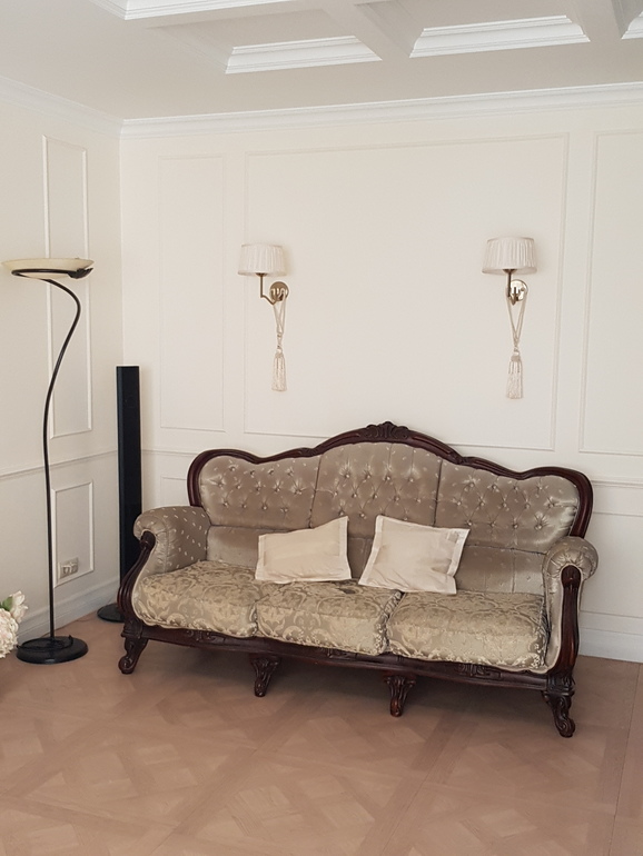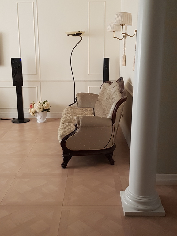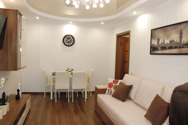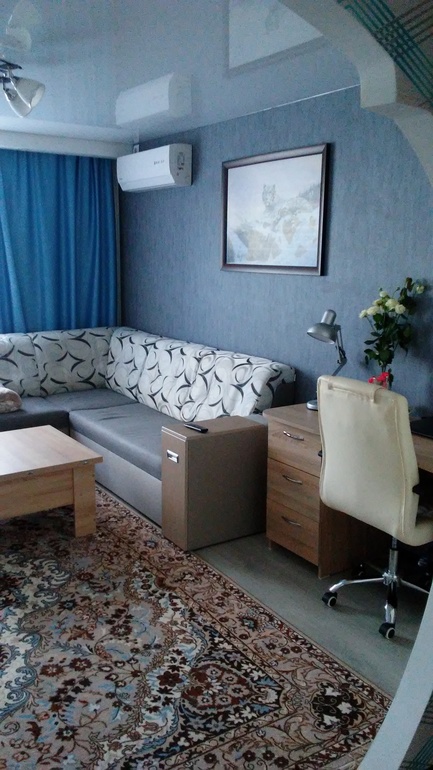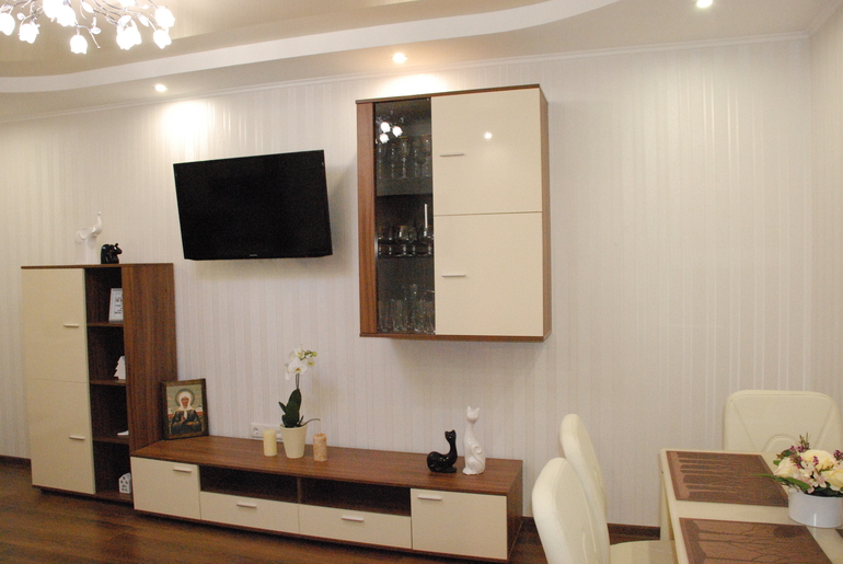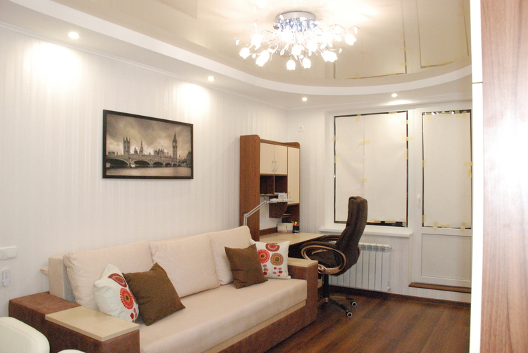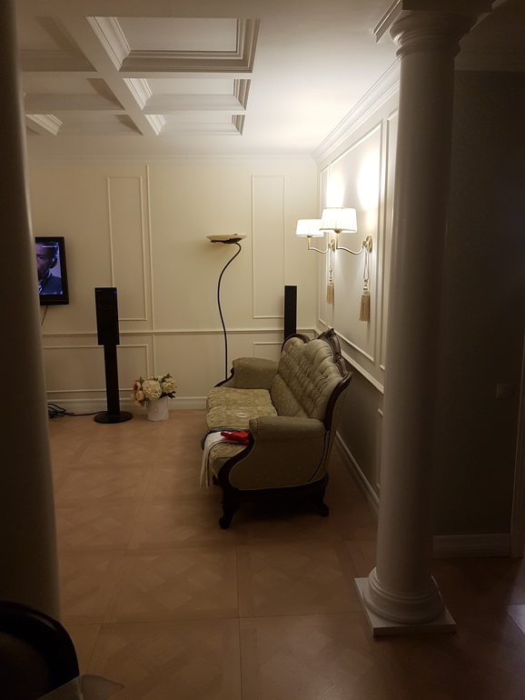 Люстру не стали вешать. В проекте сменить диван перед тв на крупный угловой.