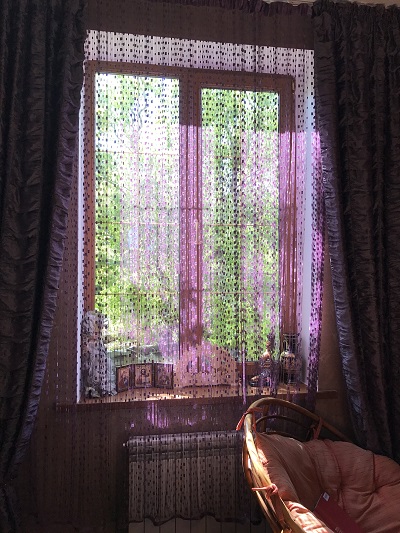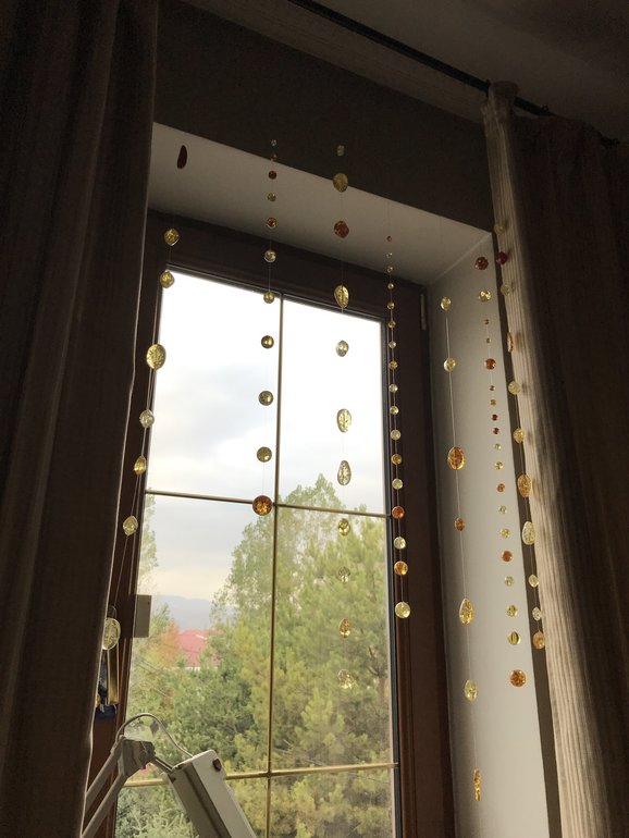 я потом в солнечный день попробую.цепляются они фиолетовыми бусинками.я,вообще,люблю бусинки,камушки). это окно коридорное,бусинки под янтарь.