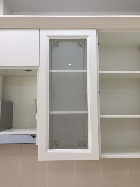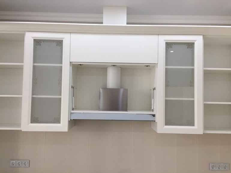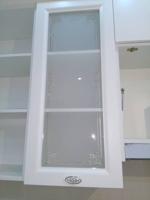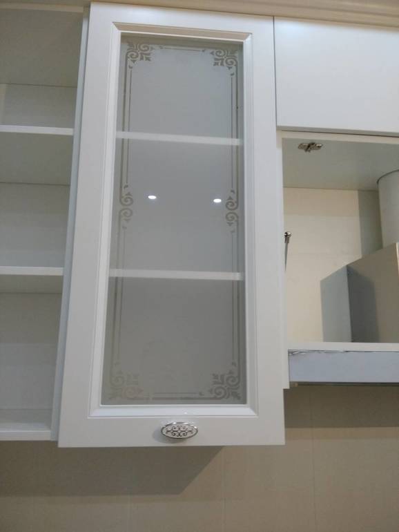 Видела кухню с этими ручками и цвет столешницы поход на мой. но там нет декора на фасаде вытяжки и стекляных с узором.