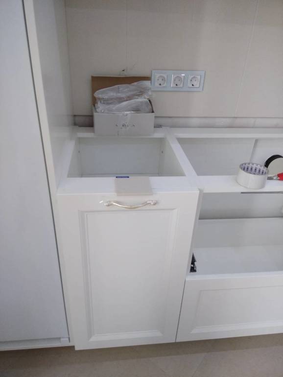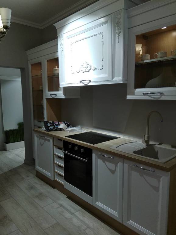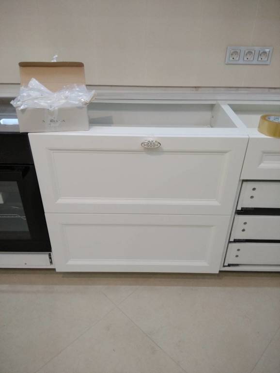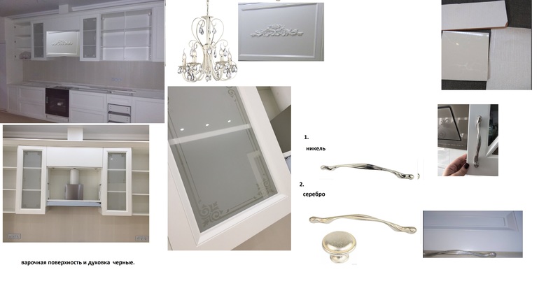 Спасибо за фото. Духовка и варочная полностью черные, без серебра. фасады чисто белые без патины. Все в бежевеньк тоне, обои с легким перламутровым блеском, но если присмотреться. Двери темный орех с тонким декором под золото с темной патной, они будут заходить в стену, раздвижные.