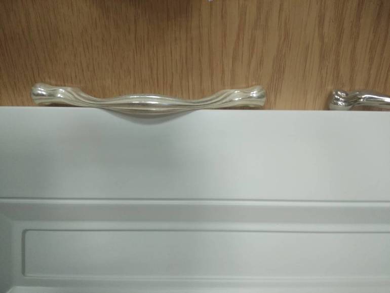 Была, вчера еще раз на кухне, делали замеры на столешницу, приложила ручки овальные и в цвет серебро к фасадам. И все таки серебро смотрится более нежнее, наряднее кухня. Овальные в никеле, сразу кухню делают "холодной", нейтральной, несмотря на узор белый. Есть легкая желтинка, но на общем фоне, она теряется. Решила остановится на них.