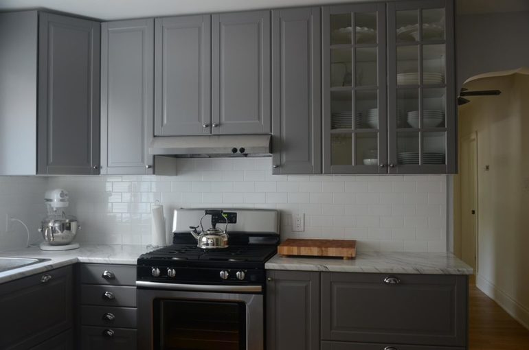 Имеем серую кухню Икеа, белые стены и темно-коричневый пол.