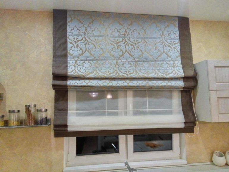 Хоть места мало, но как мне кажется, римские шторы здесь неуместны, так как по бокам шкафчики, света и так мало, а римские шторы ещё больше закроют окно. Вам бы подобрать светлых тонов шторы. Я бы на вашем месте купила ткань на шторы, у нас в СПб здесь и пошила бы необычные, но в то же время подходящие шторы.
