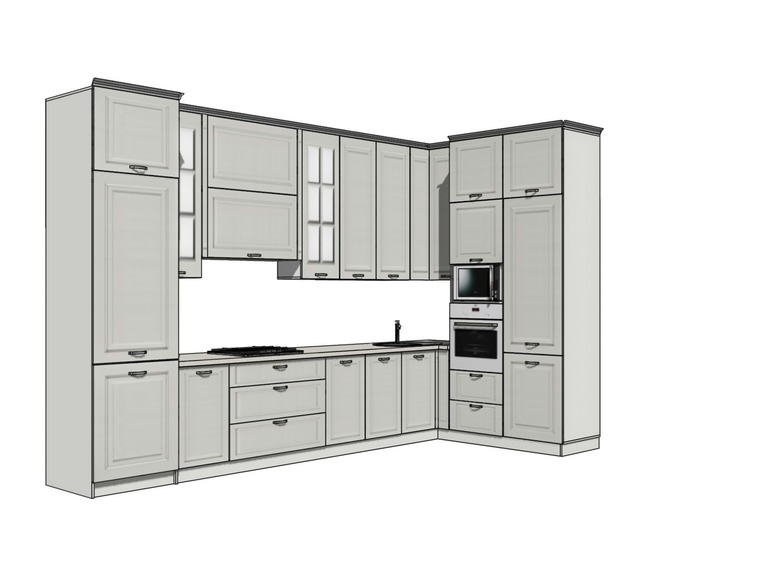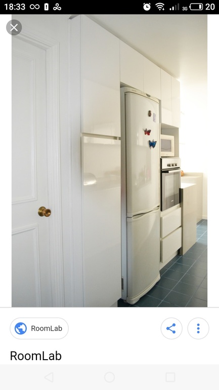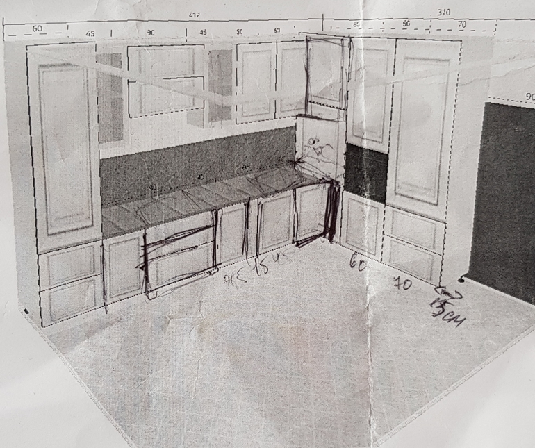 Вот предлагает сделать так. Как на рисунке. Я вот что думаю, в нишу на столешницу встроить микроволновку, на колонне шкафа сделать три двери, средняя можно декоративная какая-то, решетка или просто полки открытые, а на углы поставить двери гармошкой. И доступ к углу больше.. Мебельщики только не понимает, по ходу, как выстроить микроволновку под навесные шкафы. Может я что-то не то предлагаю . Так остается нерешенный вопрос с разными аньресолями над холодильниками и шкафом.