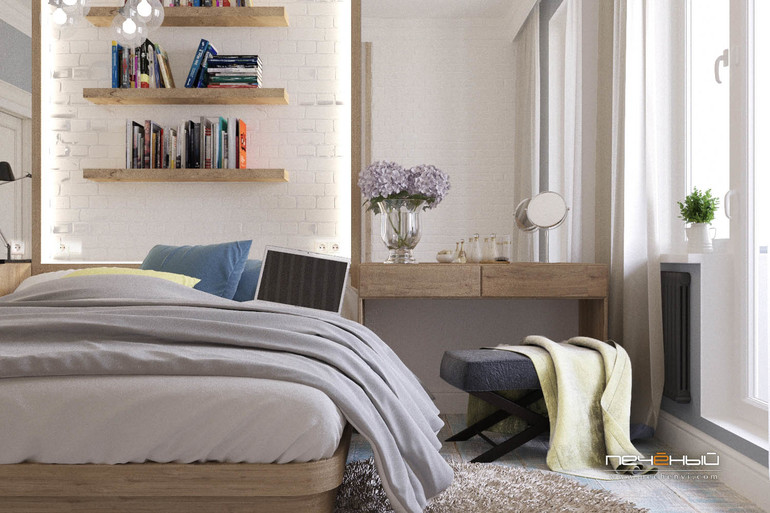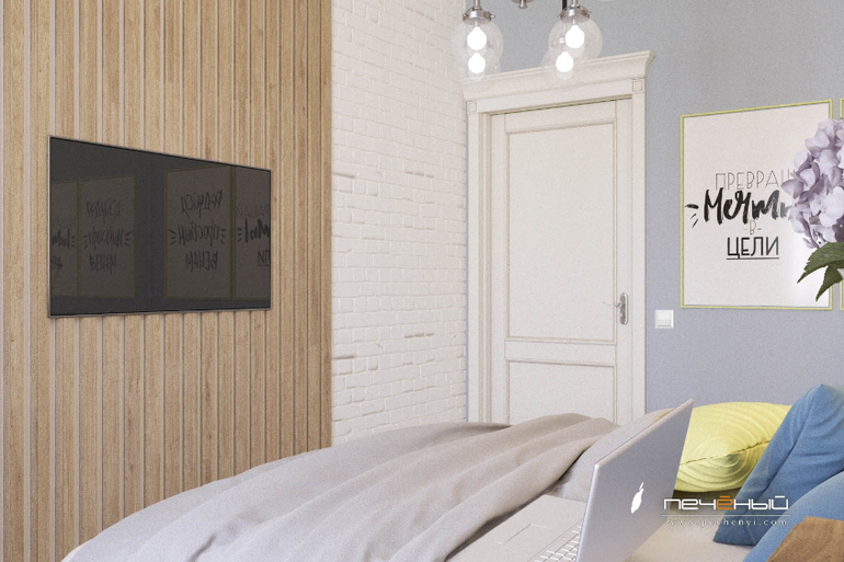 Кому-то покажется, что полки над изголовьем кровати не будут «давить» на спящего. Действительно, такой вариант размещения не подходит людям, которые не любят, чтобы у них что-то висело над головой. Заказчицу, как можно понять, это не смутило. :) С телевизором в спальне та же история - очень многие просят его повесить именно здесь, а кому-то даже мысль о телике в комнате для сна кажется дичью. Мне нравится, как получилось оформить стену напротив кровати: деревянные рейки на фоне кирпичной стены круто освежают помещение!