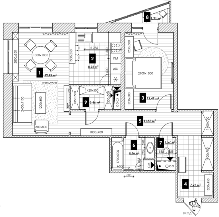 Спальня без шкафа - это недостаток или преимущество для вас? По сути, это просто нюанс, подчёркивающий индивидуальную особенность владельца квартиры. :) У заказчицы есть небольшая гардеробная, которую мы отделили от кухни стенкой, ей хватает. Кроме того, в коридоре стоит ещё два шкафа и комод, так что места для хранения одежды вполне достаточно.