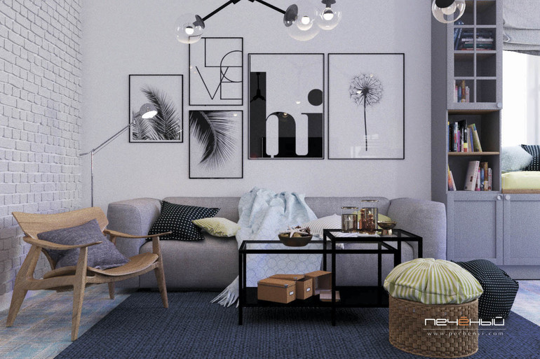 Совет: Светлые стены в комнате вполне могут быть разных оттенков: серый и голубой, серый и бежевый, белый и светло-серый. Разность цвета делает помещение более глубоким и уютным. В качестве контраста выбирайте мебель с текстурной обивкой, деревянные столешницы и немного металлических элементов - например, торшеры.