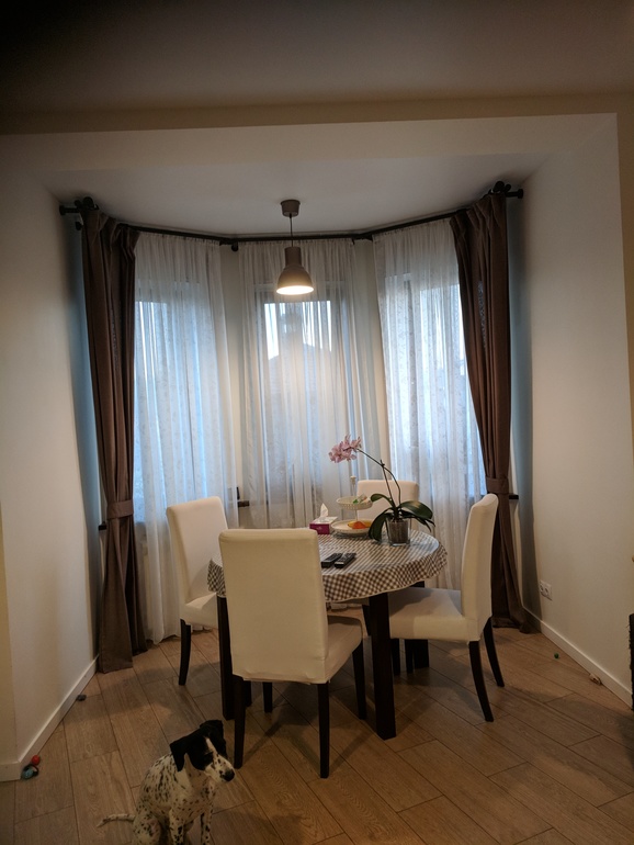 эркер очень красивый, воздушный, любой карниз его испортит. я б на окна ничего не вешала, а сделала б стекла с зеркальным напылением, чтоб с улицы не было видно, что в гостиной происходит
