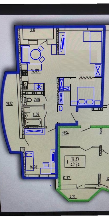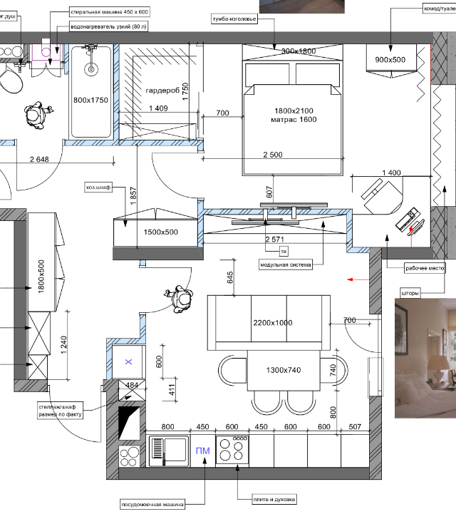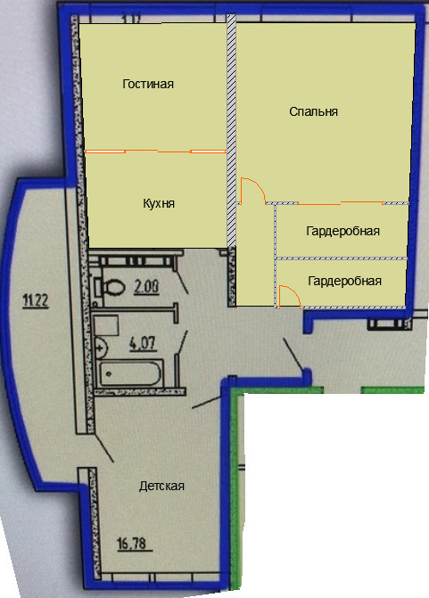 Как вариант, покажу пример подобной квартиры-распашонки. Нужна была спальня, Детская и гостиная.