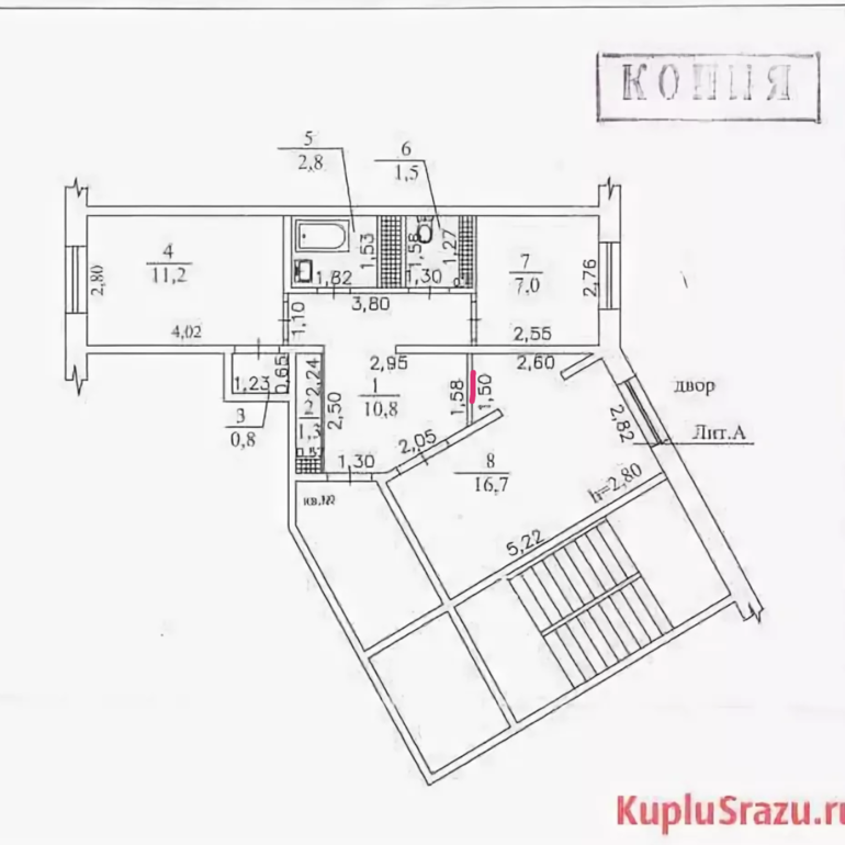 Да и кухня 2,5 на 2,5 м. Вот только кровать поставить: ни шкафа, ни комода, ещё и стояки канализационное над головой шуметь будут - плохая идея.