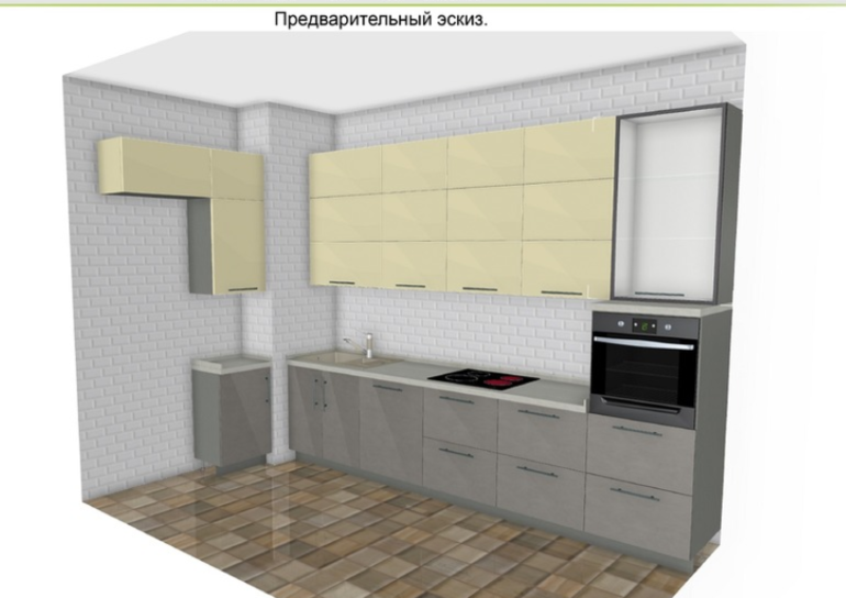 Итак. Слева холодильник отдельностоящий, далее неглубокий шкаф для мелкой техники и по длинной стене- 800 мойка и далее все по 600 (посудомоечная, плита, ящики, колонка.) Над колонкой стеклянный шкаф.