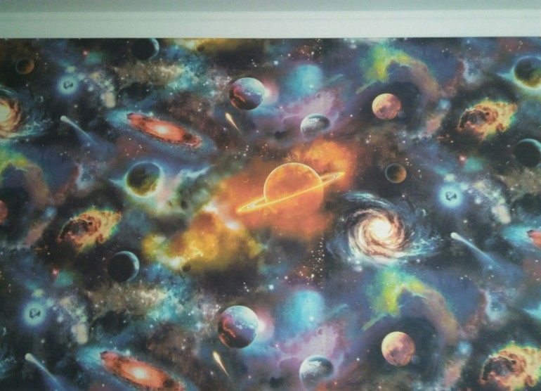 У нас одна стена космическая в детской. За 2 года не надоела)) но это стена и всего лишь 3 полосы, остальное однотон. Согласилась поклеить из-за уговоров мужской половины, ну и потому, что однотона- то у меня осталась лишняя трубочка, если захочу эти содрать)) Потолок, по-моему, надоест)