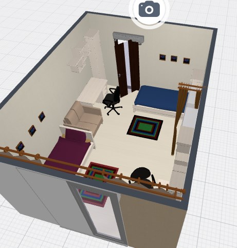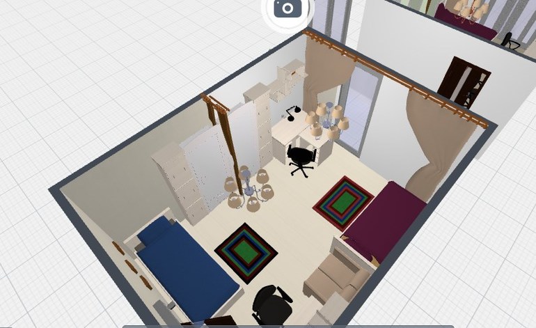 Потом зона девочки кровать120*200, напротив стол письменный, и шкаф для одежды. Между шкафами ниша для штор, при необходимости можно задвигать штору.