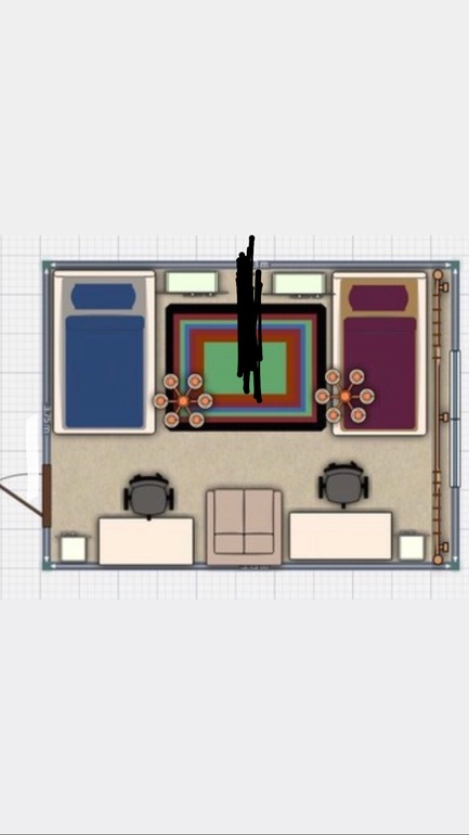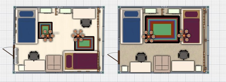 Справа варинт: комната пополам с одинаковым расположением мебели. Между кроватями остается 2 метра.