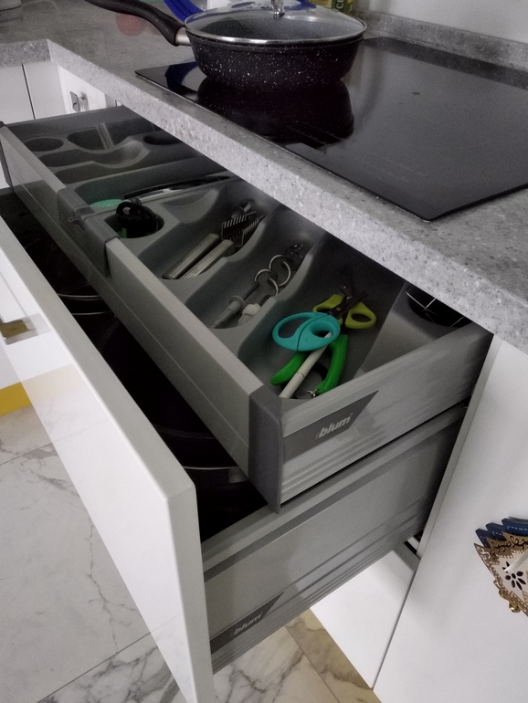 Пробовали такой вариант, но тогда под плитой получается два узких ящика в одну линию с теми ящиками, что слева и выглядит это так себе...Видимо тут либо жертвовать красотой либо практичностью придется.